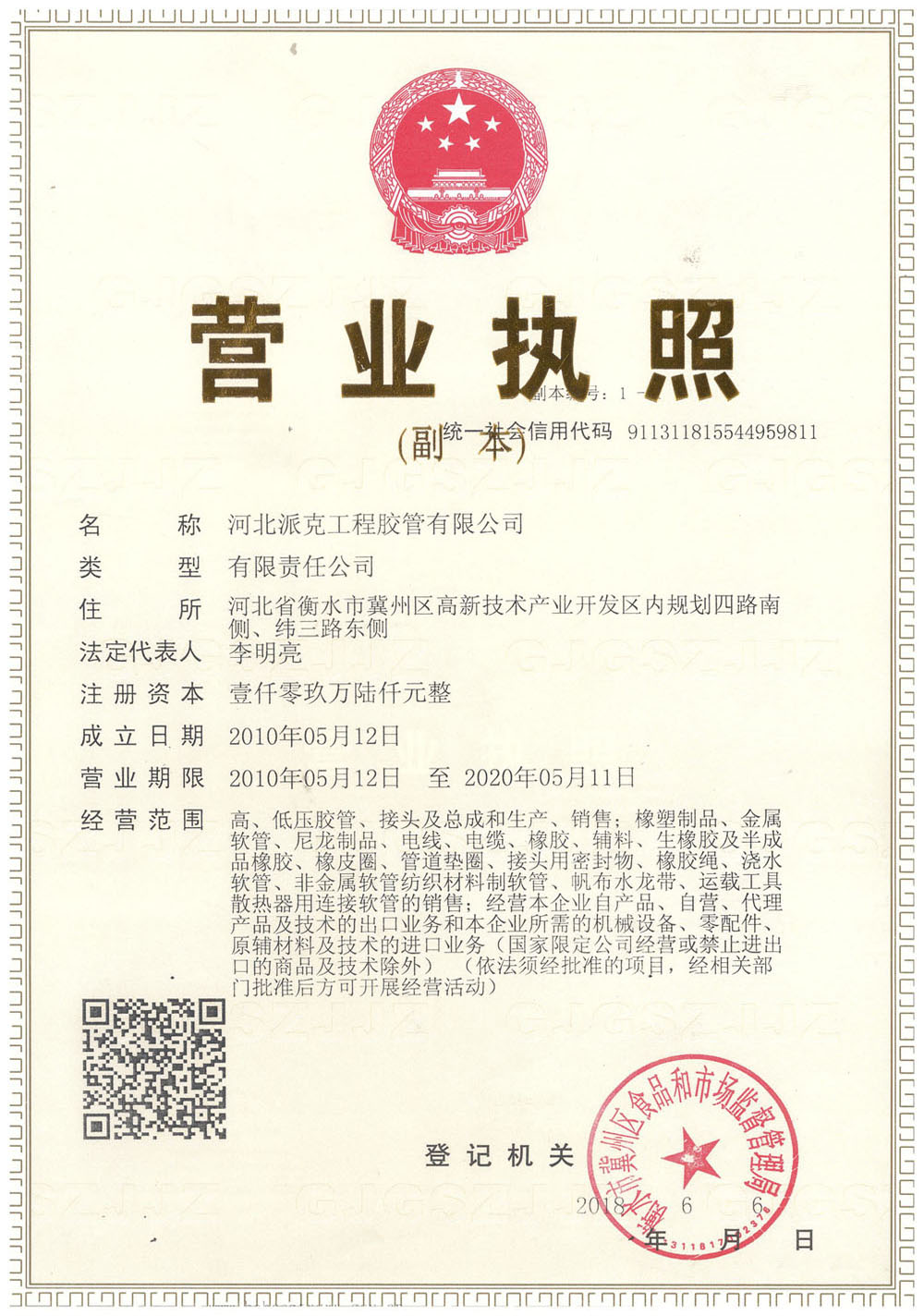 河北派克工程膠管有限公司——資質(zhì)榮譽